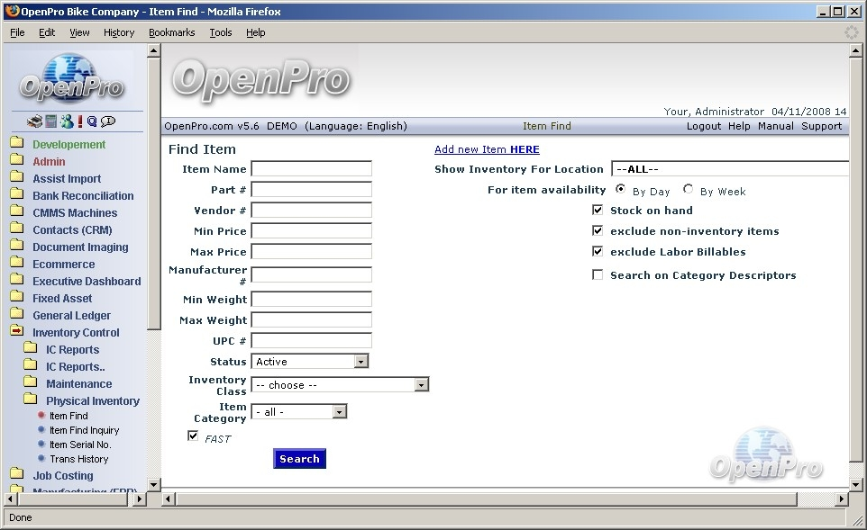 The OpenPro Standard Solution contains a number of fundamental features designed to simplify your use of the software. In this section, we describe those fundamentals in an effort to familiarize you with their use. We will use the Item Search screen below to illustrate several of the application fundamentals that are found throughout the application.