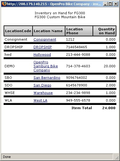 Here is the Show Inventory screen (View All Inventory icon), displaying the current stock on hand at the different specified warehouse locations:
