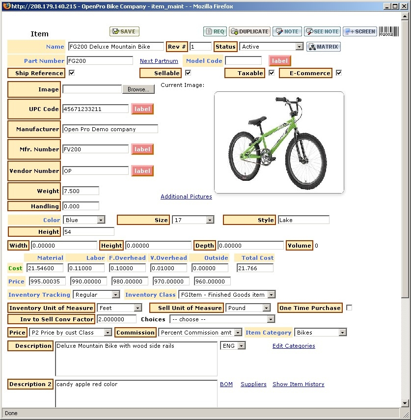 Here is the Item Edit screen (Edit icon), displaying the item and all its characteristics.