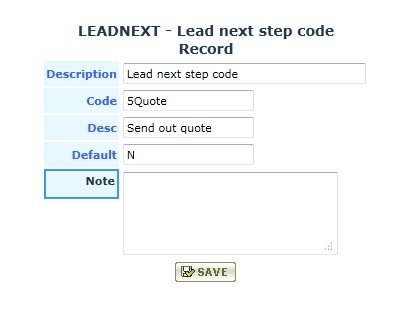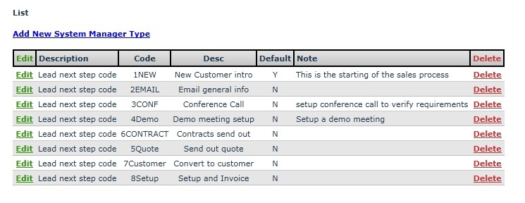 - Code: This is the value that will appear in Next Step selection lists. The Next Step values will appear in selection lists in alphanumerical sequence according to this field.
