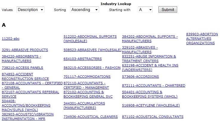 If the selection button for either field is clicked, the Industry Lookup window will open which displays Standard Industry (SIC) Codes. A partial example of this window is shown below.