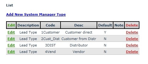 - Default - Y or N: Only one Type should have a ‘Y’ and the rest should be ‘N’. The Type with ‘Y’ will be the default when a new CRM entry is created.