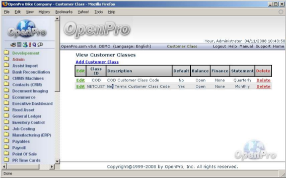 From this screen you can add new classes. To change existing classes, go to the Receivables > Maintenance > Customer Class menu and click on Edit+ next to the desired entry.