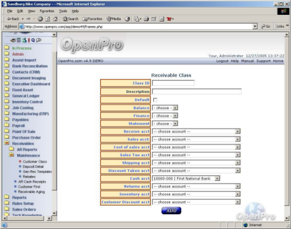 To add a receivable class, go to Receivables > Maintenance > Customer Class and click on Add Customer Class. The following screen appears: