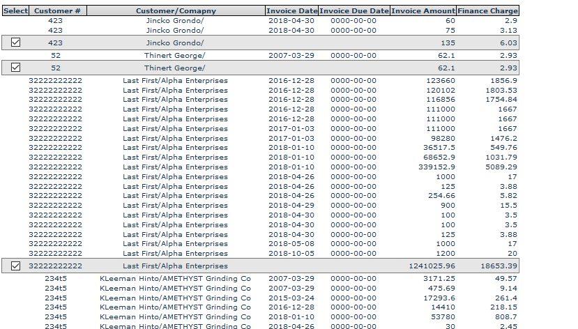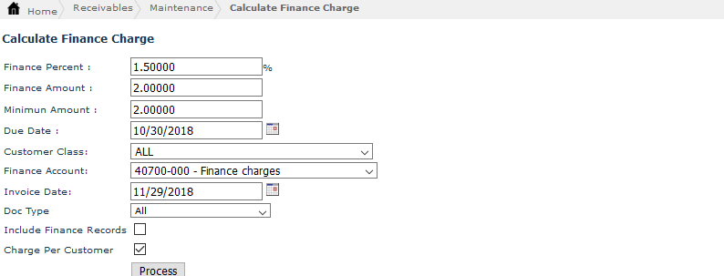 The upper part of the screen allows you to set the Finance Percent %, Finance Amount, Minimun Amount, Due Date, Customer Class, Finance Account, Invoice Date, Doc Type and decide whether you want to Charge Per Customer and Include Finance Records.