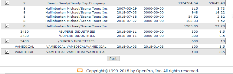 By clicking process, you are able to see a breakdown of the finance charges per company with information on Customer number ,Customer/Company, Invoice Date, Invoice Due Date, Invoice Amount and Finance Charge. You can select or deselect the companies and click the post button to commit the same.
