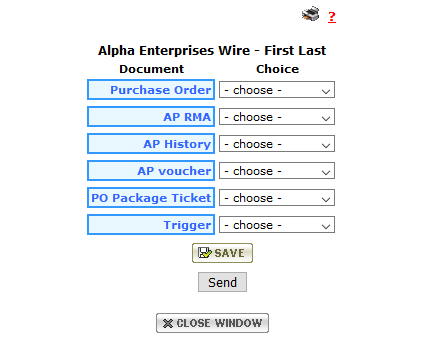 The Doc Choices tab allows you to select documents associated with a specific vendor and how each of these will be delivered/communicated. There are various documents such as Purchase Order, Return Material Authorization, Payables History, AP voucher, PO Package Ticket and Trigger.