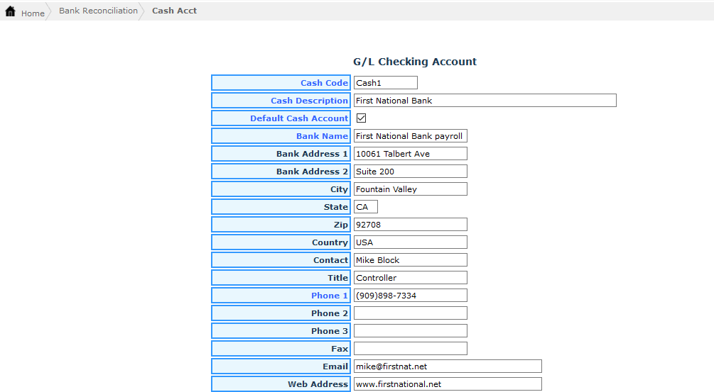 - Default Cash Account-This is the default cash account used by the company Only one account can be defaulted.