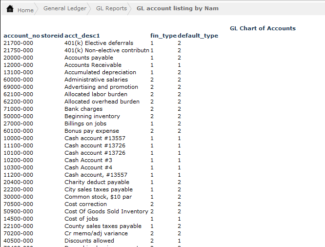 The GL Listing by Name Screen allows the user to view a list of all the chart of accounts as held in the Chart of Accounts File by Name. It is the list of all of your G/L accounts sorted by Names.