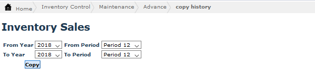 The Copy History Screen allows you to copy all the sales activity for all goods purchased and held for resale to customers from one year or period to another. You are able to select the year and period for which you want to update records then clicking Copy.