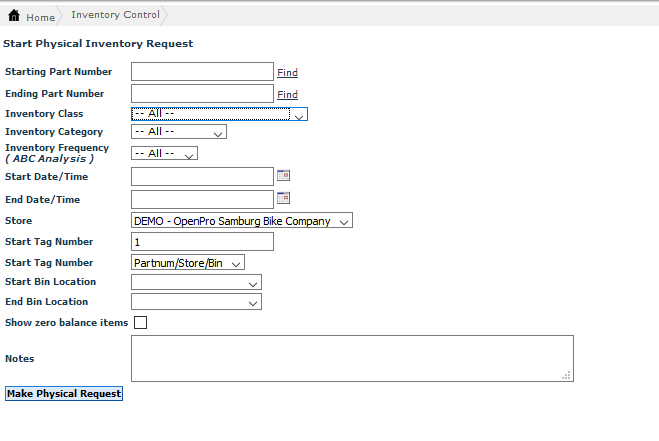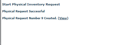 The Physical Inventory Request Screen allows an Inventory request to be entered. This can be used for cycle counting or a complete physical process.