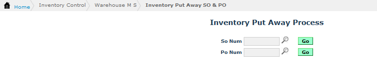 The Inventory Put Away SO&PO Screen handles the process of receiving inventory into the company and moving it to the warehouse, replenishment area or the picking area. This selection allows you to put away inventory based on specific invoices (SO) or purchase orders (PO)