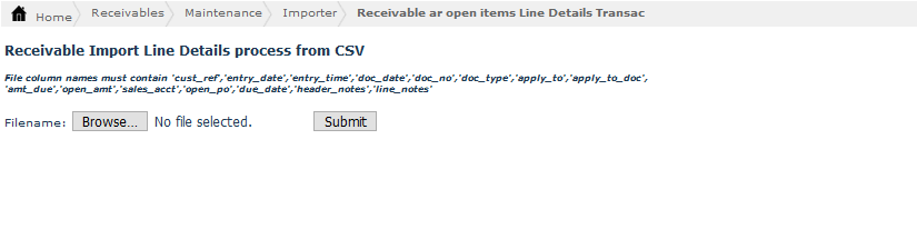 The File column names must contain 'cust_ref','entry_date','entry_time','doc_date','doc_no','doc_type','apply_to','apply_to_doc', 'amt_due','open_amt','sales_acct','open_po','due_date','header_notes','line_notes'