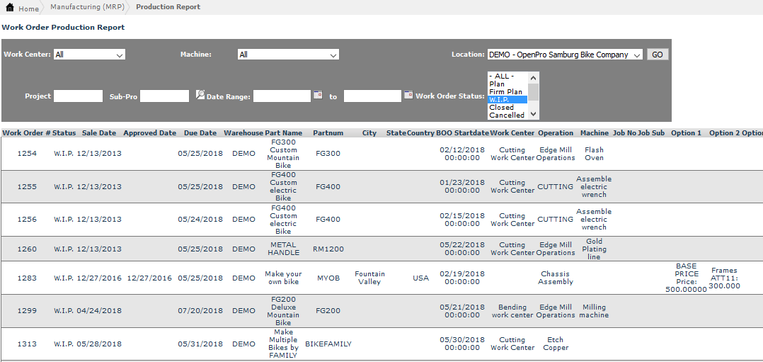 The Work Order Production Report screen allows you to generate reports based on your work assignment/allocation to help in evaluation outputs from the production units. You can generate production reports based on Work Centers, Machine, work location, project and sub project, Job Cost, Date Range and Work Order Status.