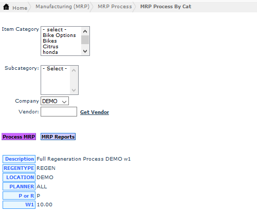 The MRP Process By Cat screen helps you in calculating the materials and components needed to manufacture your products based on item categories. The MRP process starts by taking inventory of the materials on hand, identifying required materials and components and then scheduling for production.