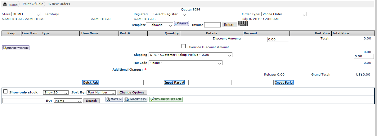 The New Orders screen allows you to set up new customer orders by selecting the customer associated with the order and various order items. You are also able to setup shipping details with each order.
