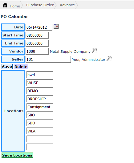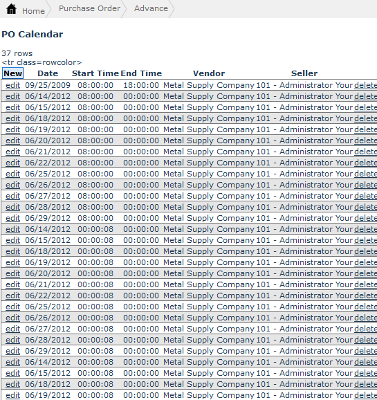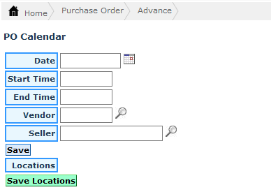 The PO Calendar Master screen allows you to view all calendar entries for purchase orders with the entire Purchase Order module. It allows you to view all calendar entries for various PO schedules with details on Date, start Time, End Time, Vendor and Seller. You can create new or delete calendar entries on this screen by clicking on New and Delete respectively.