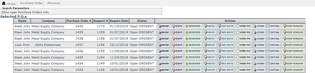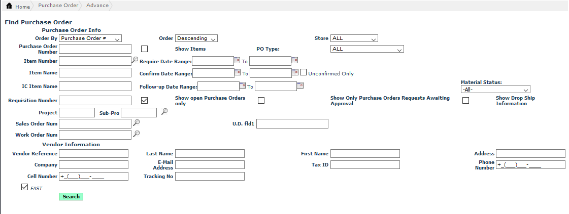 To narrow down your search, you can filter results based on how you want your results ordered, Purchase Order number, PO Type, Item Number, Require Date Range, Item Name, Confirmed Date Range, IC Item Name, Follow-up Date Range, Requisition number, Sales Order Number, Work Order Number, Vendor Information such as Vendor Reference, Last Name, First Name, Address, Company, E-Mail Address, Tax ID, Phone Number and Tracking Number.