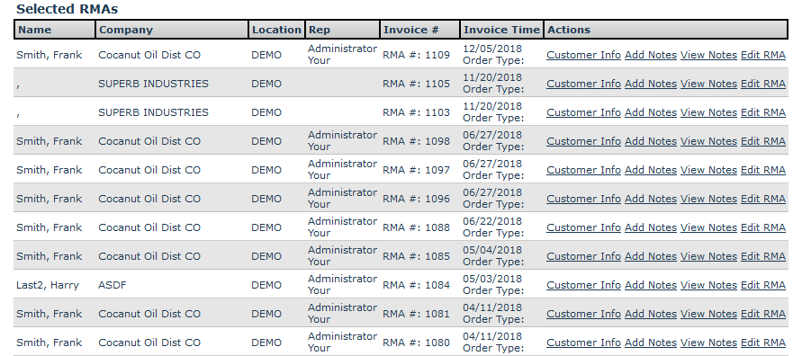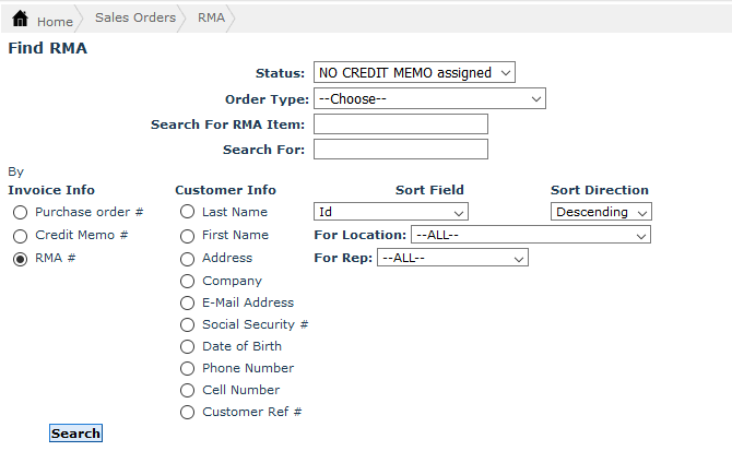 The RMA Search screen allows you to search for a specific return material authorization undertaken for different items. You can search based on the RMA Status, Order Type, RMA customer information and invoice information.