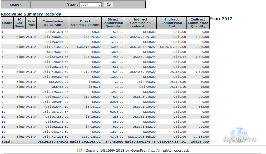 The upper part of the screen allows you to select the year whereas the lower section of the screen gives a summary of commissions and grand totals.