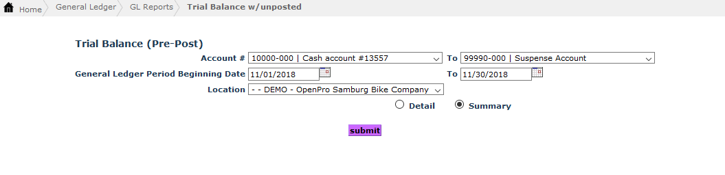 The upper section allows you to filter the details you need to populate based on account number, GL beginning and end date, location and whether you need detailed or a summary.