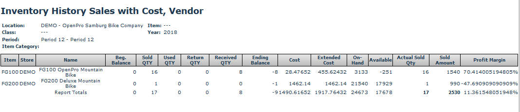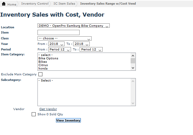 The Inventory Sales with Cost, Vendor Screen allows you to view inventory sales within a period or year based on selected vendor (s). You can filter based on Vendor, Location , Item, Class, Year, category, subcategory and Period.