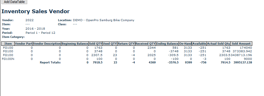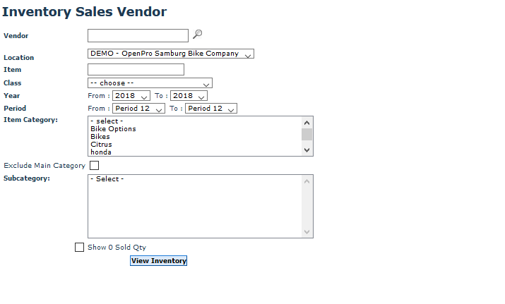 The Inventory Sales Range by Vendor Screen allows you to view sales inventory within a certain year range or period range based on specific vendors. You can filter based on Location, Item, Class, Year, Period, Item Category and subcategory.