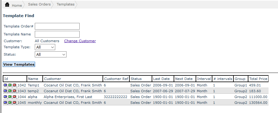 You can search for a template based on template order number, name, customer, type and status then clicking View Templates