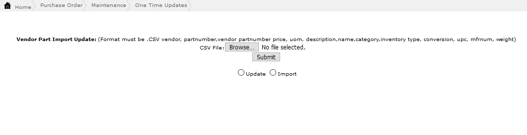 The vendor Part Import Update screen allows you to modify your listing of vendor item parts. To update the parts list, you need to select a CSV file that has CSV vendor, partnumber,vendor partnumber price, uom, description,name,category,inventory type, conversion, upc, mfrnum and weight fields.