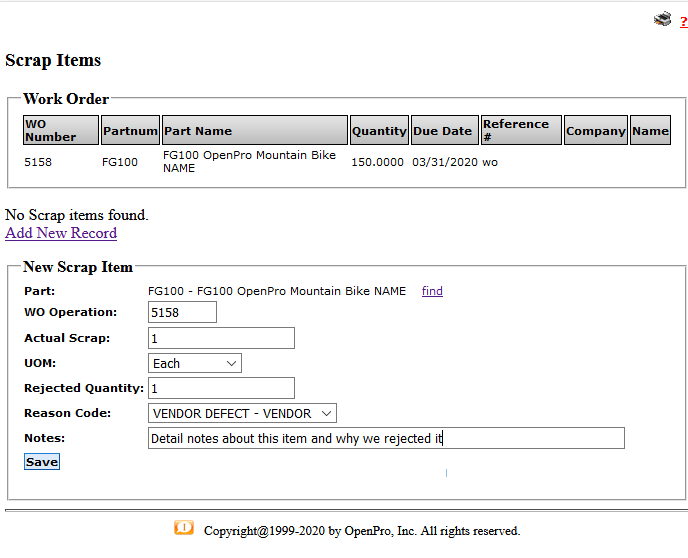 Work order scrap item screen is used to issue scrap from the work order process and document how much scrap is created as part of the order order processing.
